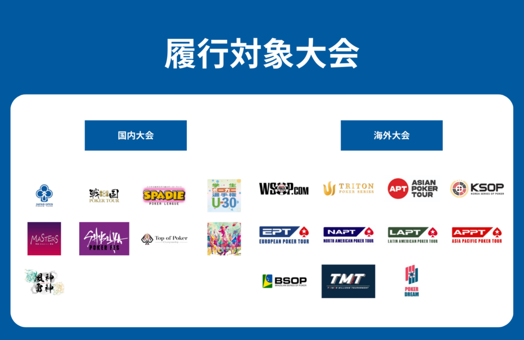 ・海外で開催される提携大会APT(Asian Poker Tour)を含む対象大会への参加費、渡航費、宿泊費